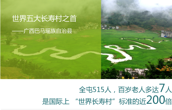 廣西巴馬瑤族自治縣位于廣西盆地和云貴高原的斜坡地帶,總?cè)丝?3萬人。據(jù)廣西巴馬縣民政局消息,截止到2010年6月8日,廣西巴馬瑤族自治縣100歲及以上的長壽老人達(dá)87人,每10萬人里有37.826個,是國際長壽村標(biāo)準(zhǔn)的5.043倍。比2000年第五次全國人口普查時74人多13人。是世界五大村中惟一長壽老人不斷增多的地方。被譽為世界五大長壽村之首。其中,一個叫甲篆鄉(xiāng)平安村巴盤屯的地方,全屯515人,百歲老人多達(dá)7人,是國際上 “世界長壽村”標(biāo)準(zhǔn)的近200倍。