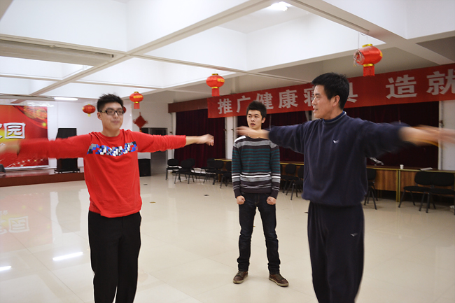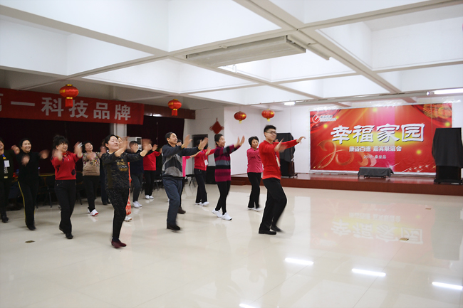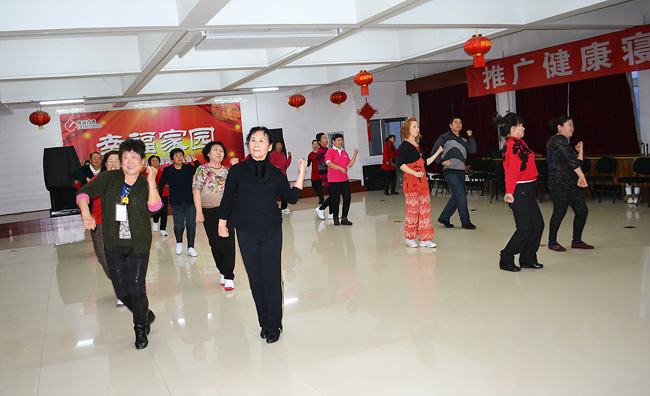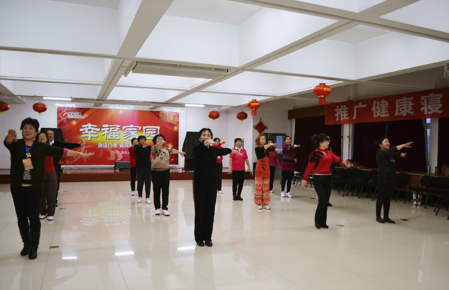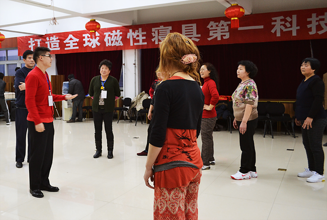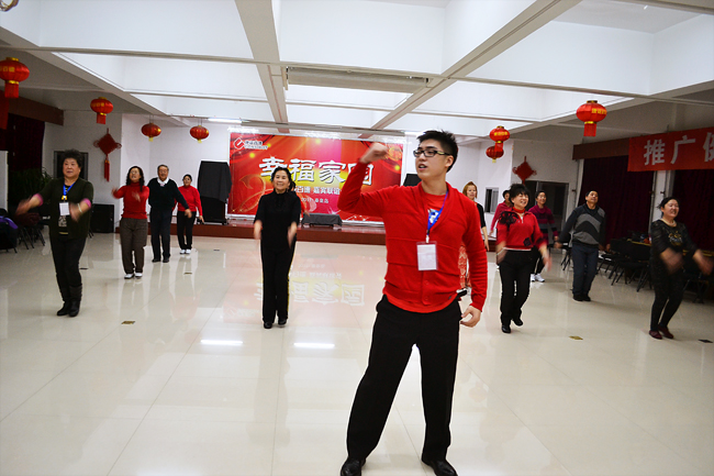 最早趕到康姿百德公司排練場(chǎng)地的是16位伴舞人員,都是50歲以上的中老年人。她們從早晨8點(diǎn)半開(kāi)始便投入了一遍又遍地排練。每排練一遍,舞蹈老師都會(huì)進(jìn)行細(xì)微的糾正、調(diào)整隊(duì)形和調(diào)動(dòng)情緒。每位健身操隊(duì)員也沒(méi)有因?yàn)榉磸?fù)的走位表現(xiàn)出疲憊或煩躁,始終面帶笑容,激情勃勃的投入排練。因?yàn)橥度氲倪\(yùn)動(dòng)量非常大,很多人都是滿頭大汗,演員們就索性脫下厚實(shí)的棉衣輕裝上陣。