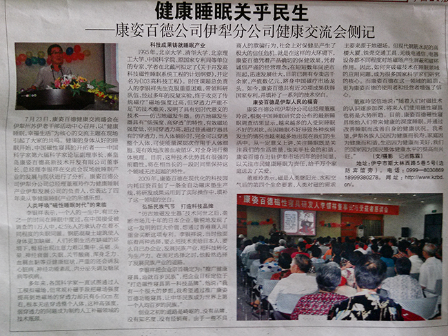 7月23日,康姿百德健康交流盛會(huì)在新疆伊犁州蘇伊老干部活動(dòng)中心舉行,以“健康睡眠、幸福生活”為核心的交流主題引起了與會(huì)代表的共鳴。中國(guó)磁性寢具的開拓者—第六屆中國(guó)科學(xué)家論壇副理事長(zhǎng)、秦皇島康姿百德高新技術(shù)開發(fā)有限公司董事長(zhǎng)、總經(jīng)理李銀祥就健康睡眠產(chǎn)業(yè)的發(fā)展與現(xiàn)狀進(jìn)行了深入分析??底税俚鹿疽晾绶止究偨?jīng)理董雁玲向與會(huì)代表交流了從事健康睡眠產(chǎn)業(yè)四年來的所感所想。7月24日《伊犁晚報(bào)》對(duì)此次會(huì)議作了題為“健康睡眠、關(guān)乎民生”的專題報(bào)道。