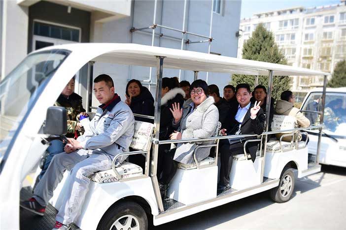 即將入職的區(qū)域經(jīng)理和店面經(jīng)理乘坐觀光車參觀康姿百德自動(dòng)化生產(chǎn)線