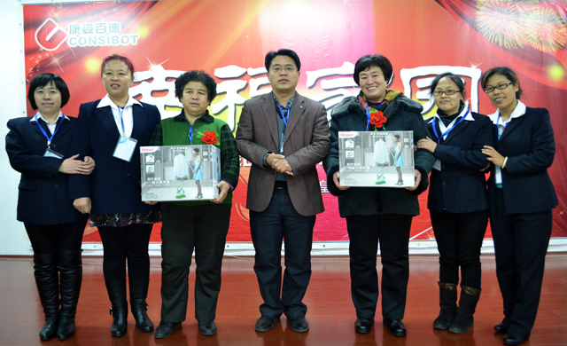 健康體驗大使梁桂秋、姜淑英獲獎后與錦州康姿百德經理劉文斌及部分店員合影