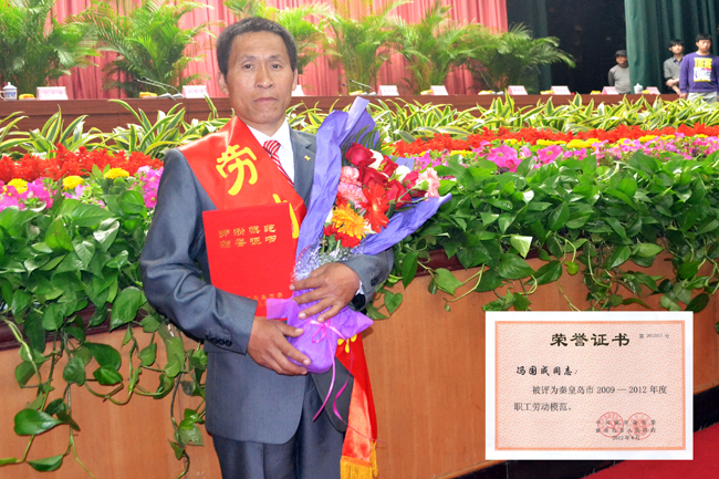 2012年4月24日,秦皇島市2009—2012年度市級(jí)勞動(dòng)模范表彰暨慶?!拔逡弧眹?guó)際勞動(dòng)節(jié)大會(huì)在秦皇島工人文化宮隆重召開??底税俚鹿局圃旌笄诓繖C(jī)電主管馮國(guó)成同志被授予“秦皇島市2009-2012年度職工勞動(dòng)模范”榮譽(yù)稱號(hào),并受到了秦皇島市市委、市政府各級(jí)領(lǐng)導(dǎo)的親切接見。