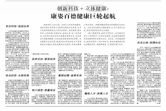 “讓科技造福生命”的企業(yè)使命,使得康姿百德的事業(yè)與黨中央提出的“健康中國(guó)”一脈相承。而在當(dāng)今環(huán)境污染、食品安全等問題日益嚴(yán)峻的形勢(shì)下,健康產(chǎn)業(yè)更是迎來了新的發(fā)展機(jī)遇。