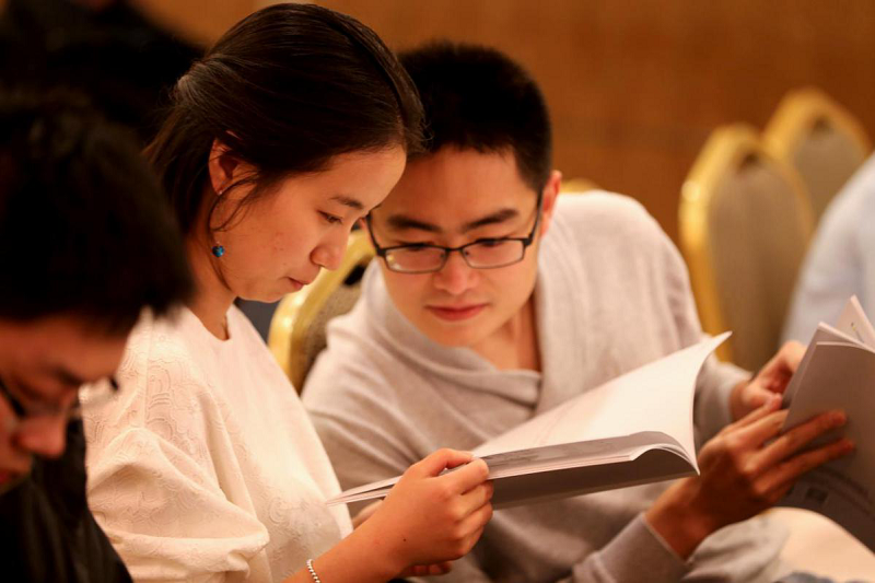 認真觀看康姿百德公司資料的北大學子。