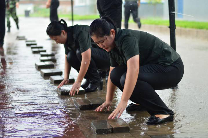 雨勢過大,腳下的路亦要守護(hù),一鼓作氣,徒手為學(xué)員們搭建愛心之路。