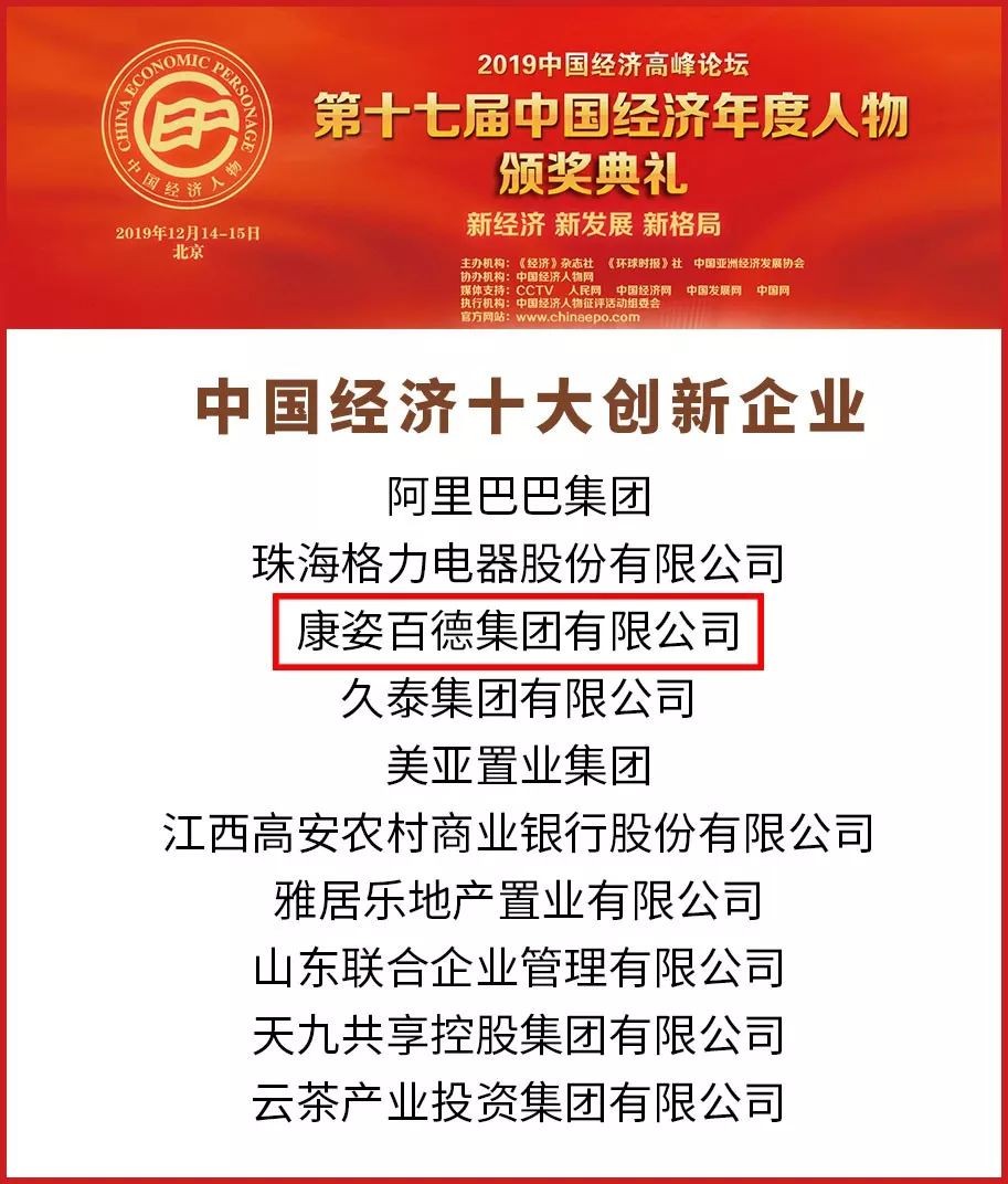 2019年12月15日,以“新經(jīng)濟、新發(fā)展、新格局”為主題,由《經(jīng)濟》雜志社、《環(huán)球時報》社、中國亞洲經(jīng)濟發(fā)展協(xié)會聯(lián)合舉辦的“2019中國經(jīng)濟高峰論壇暨第十七屆中國經(jīng)濟人物年會” 在京隆重舉行。康姿百德集團榮獲“中國經(jīng)濟十大創(chuàng)新企業(yè)”榮譽稱號。