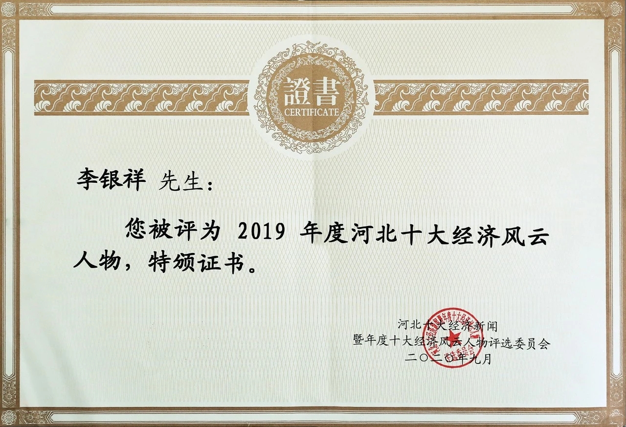 “河北十大經(jīng)濟風云人物”榮譽證書
