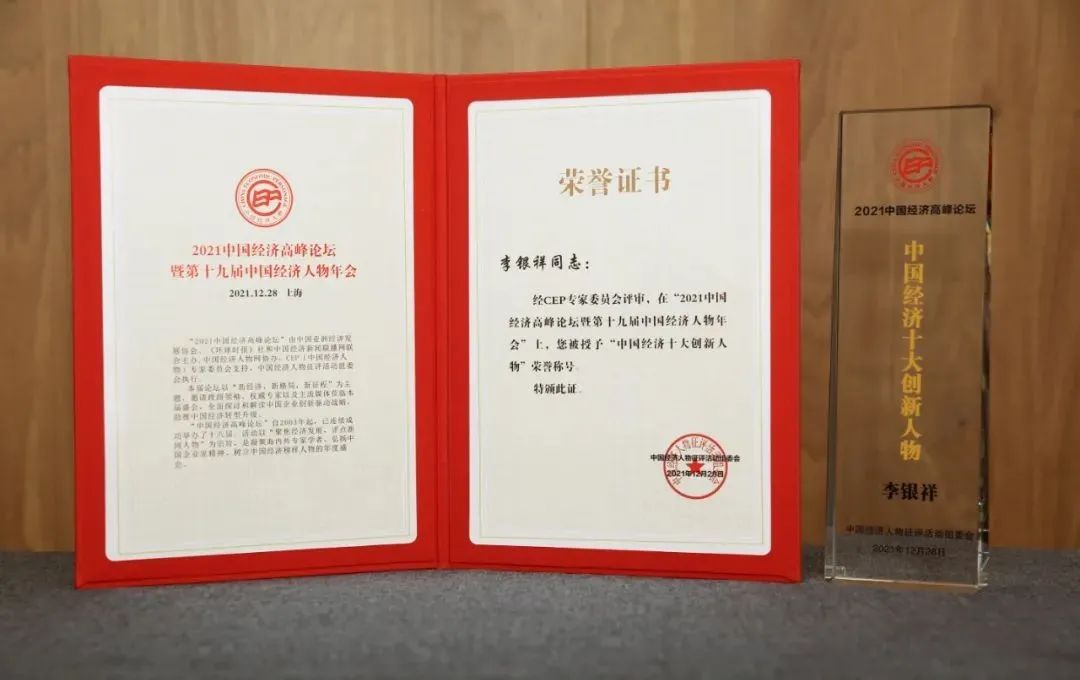 “中國經(jīng)濟十大創(chuàng)新人物”榮譽獎杯和證書