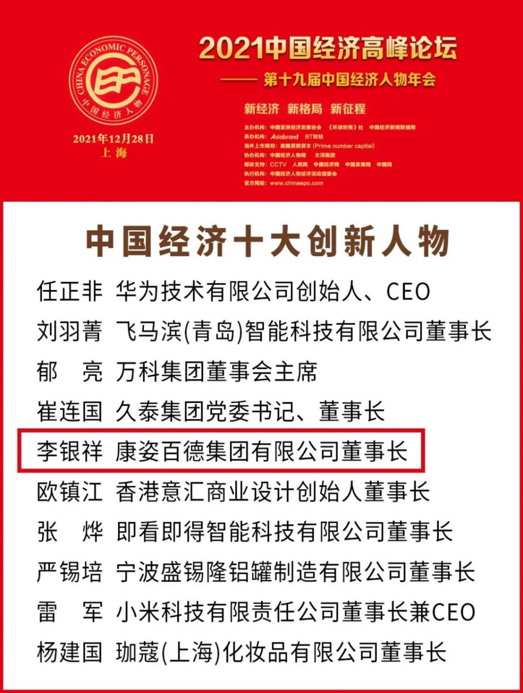 2021年12月28日,“2021中國經(jīng)濟高峰論壇暨第十九屆中國經(jīng)濟人物年會” 在上海成功舉行。本次活動由中國經(jīng)濟新聞聯(lián)播網(wǎng)、《環(huán)球時報》社、中國亞洲經(jīng)濟發(fā)展協(xié)會聯(lián)合主辦。康姿百德集團董事長李銀祥榮獲“中國經(jīng)濟十大創(chuàng)新人物”榮譽稱號。