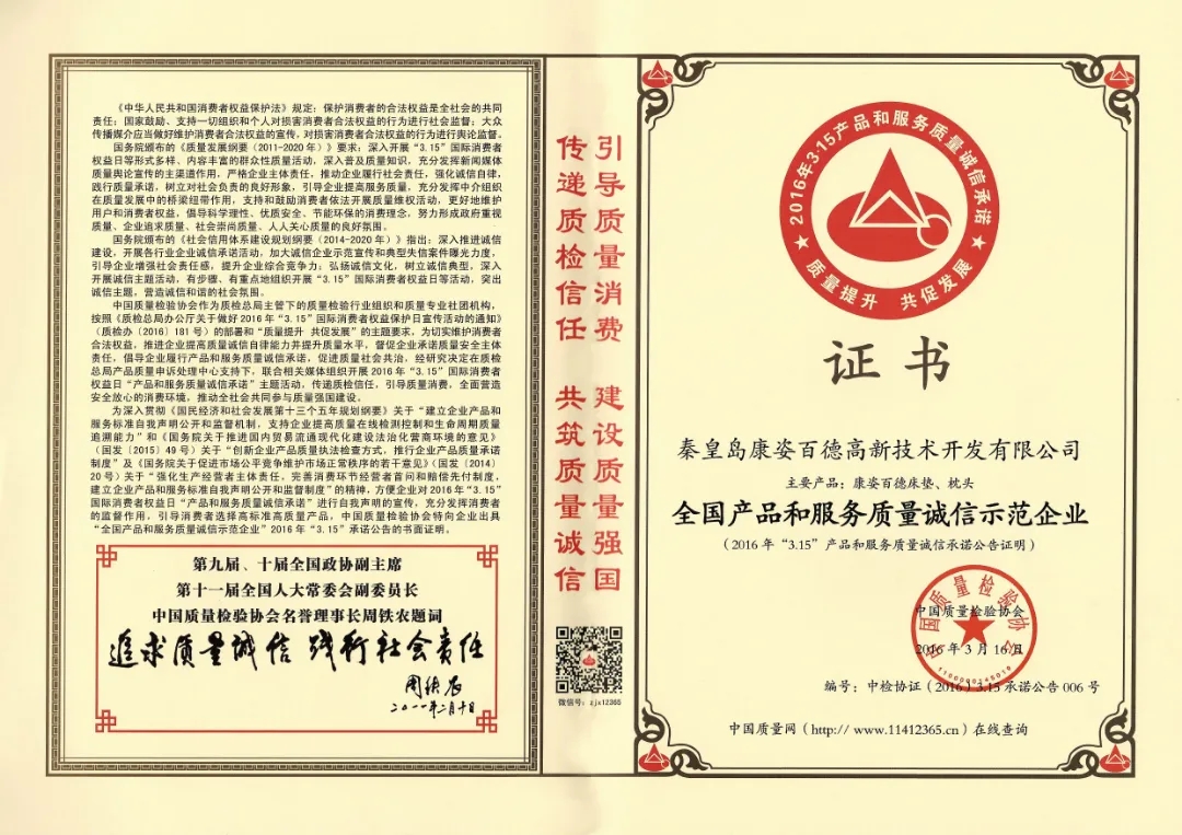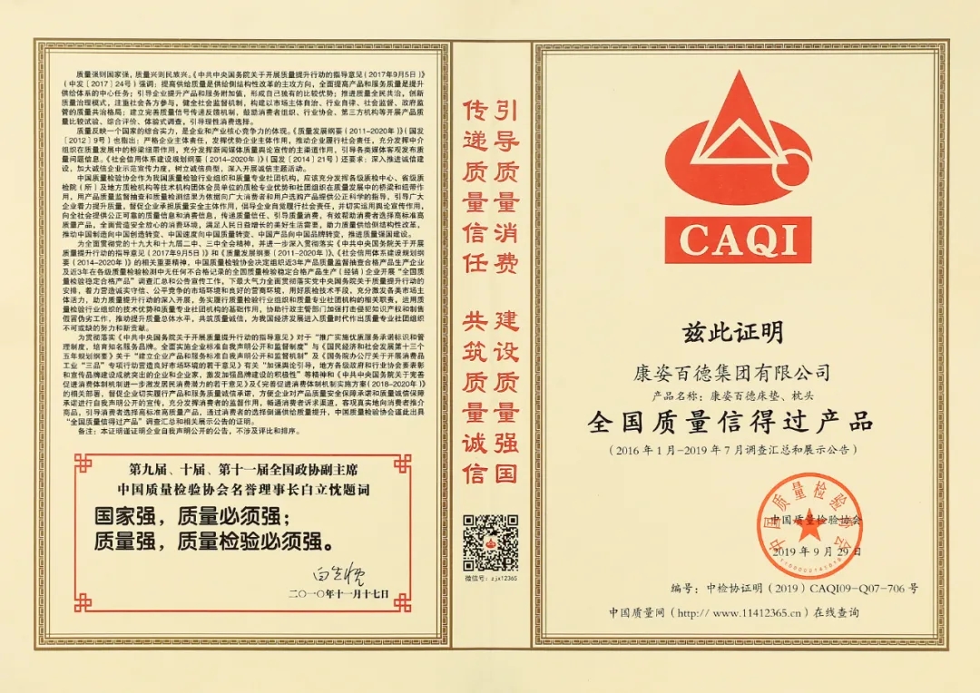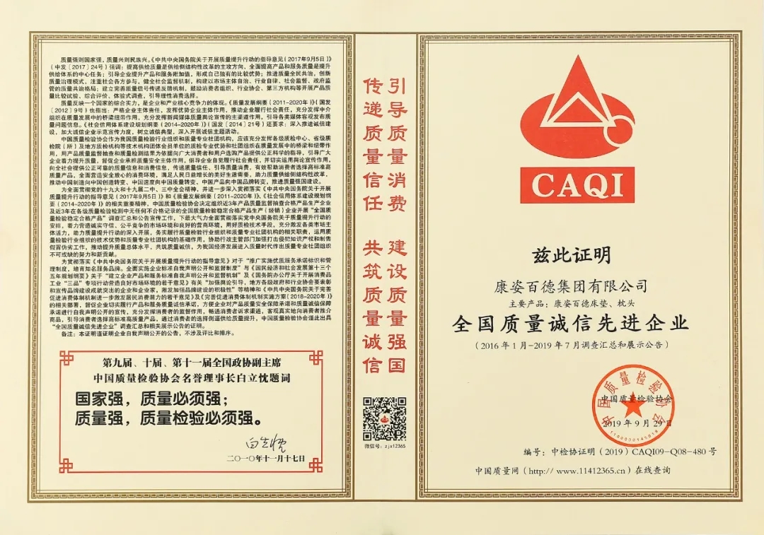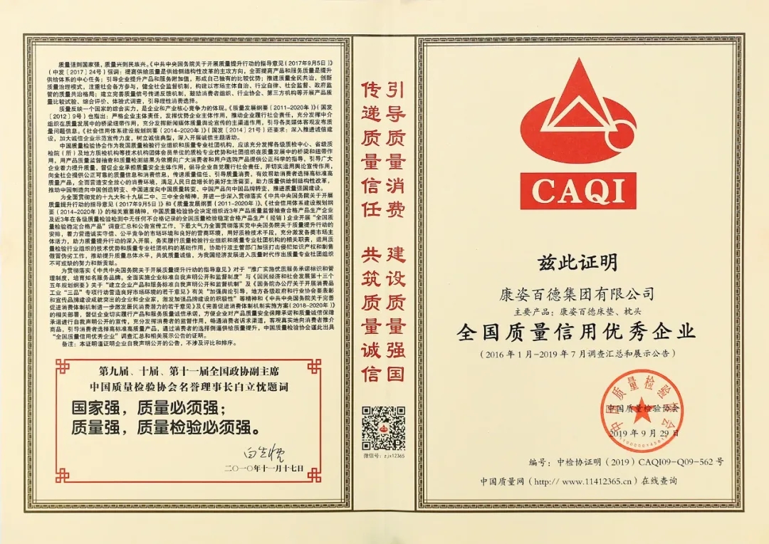 在李銀祥董事長(zhǎng)的帶領(lǐng)下,康姿百德始終堅(jiān)持誠信經(jīng)營(yíng),并先后榮獲了”全國產(chǎn)品和服務(wù)質(zhì)量誠信示范企業(yè)“、“全國質(zhì)量信用優(yōu)秀企業(yè)”、”全國質(zhì)量誠信先進(jìn)企業(yè)”、“全國質(zhì)量信得過產(chǎn)品”等多項(xiàng)榮譽(yù)。