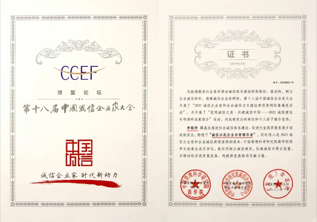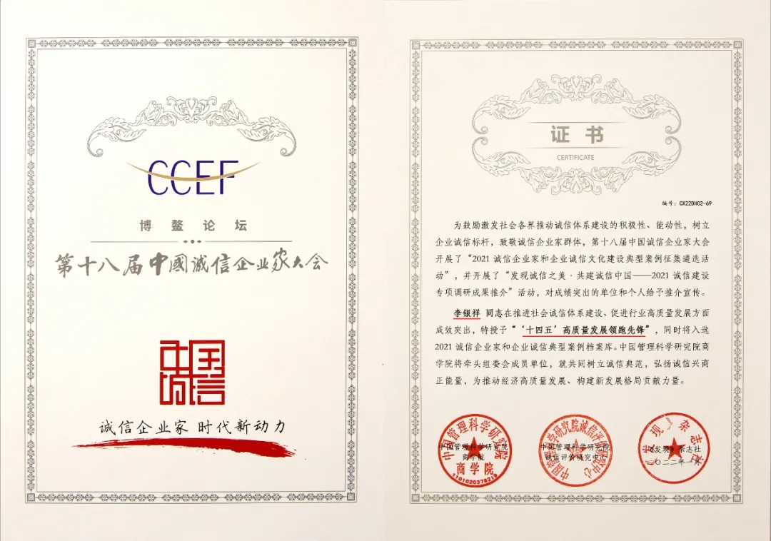 中國誠信企業(yè)家大會(huì)期間,經(jīng)中國管理科學(xué)研究院商學(xué)院學(xué)術(shù)委員會(huì)評(píng)定,李銀祥董事長(zhǎng)還被聘任為中國管理科學(xué)研究院商學(xué)院“十四五”規(guī)劃編制專家組成員。