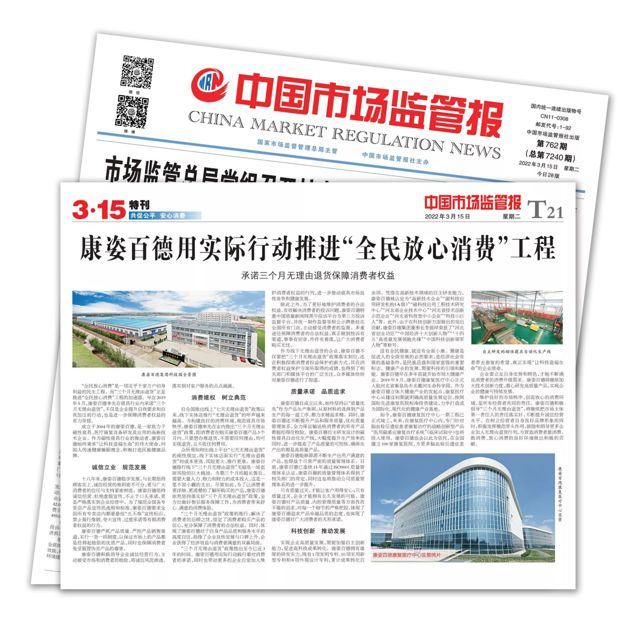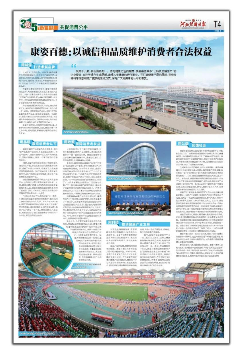 《中國(guó)市場(chǎng)監(jiān)管報(bào)》由國(guó)家市場(chǎng)監(jiān)督管理總局主管,是一張面向全國(guó)工商行政管理和市場(chǎng)監(jiān)管部門(mén)系統(tǒng)、廣大工商企業(yè)和消費(fèi)者讀者的經(jīng)濟(jì)法制類報(bào)紙,是宣傳工商行政管理工作、詮釋工商行政管理法律法規(guī)的權(quán)威媒體??底税俚履軌驑s登《中國(guó)市場(chǎng)監(jiān)管報(bào)》,說(shuō)明康姿百德在消費(fèi)者維權(quán)方面所做出的突出貢獻(xiàn),得到了社會(huì)各界的充分肯定,也贏得了廣大消費(fèi)者的贊譽(yù)。