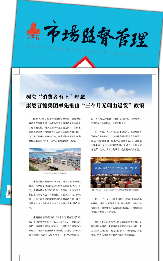 《市場(chǎng)監(jiān)督管理》1953年創(chuàng)刊,前身為《工商行政管理》雜志,曾被新聞出版總署認(rèn)定為雙效期刊,榮獲“第二屆國(guó)家期刊百種重點(diǎn)期刊”稱號(hào)?!妒袌?chǎng)監(jiān)督管理》雜志專業(yè)、權(quán)威、實(shí)用,在市場(chǎng)監(jiān)管系統(tǒng)內(nèi)有著廣泛而深厚的影響力。康姿百德在消費(fèi)者維權(quán)方面,積極響應(yīng)國(guó)家市場(chǎng)監(jiān)督管理總局的號(hào)召,自主在行業(yè)內(nèi)推行“三個(gè)月無(wú)理由退貨”政策,贏得了廣大消費(fèi)者和權(quán)威媒體的肯定與認(rèn)可。