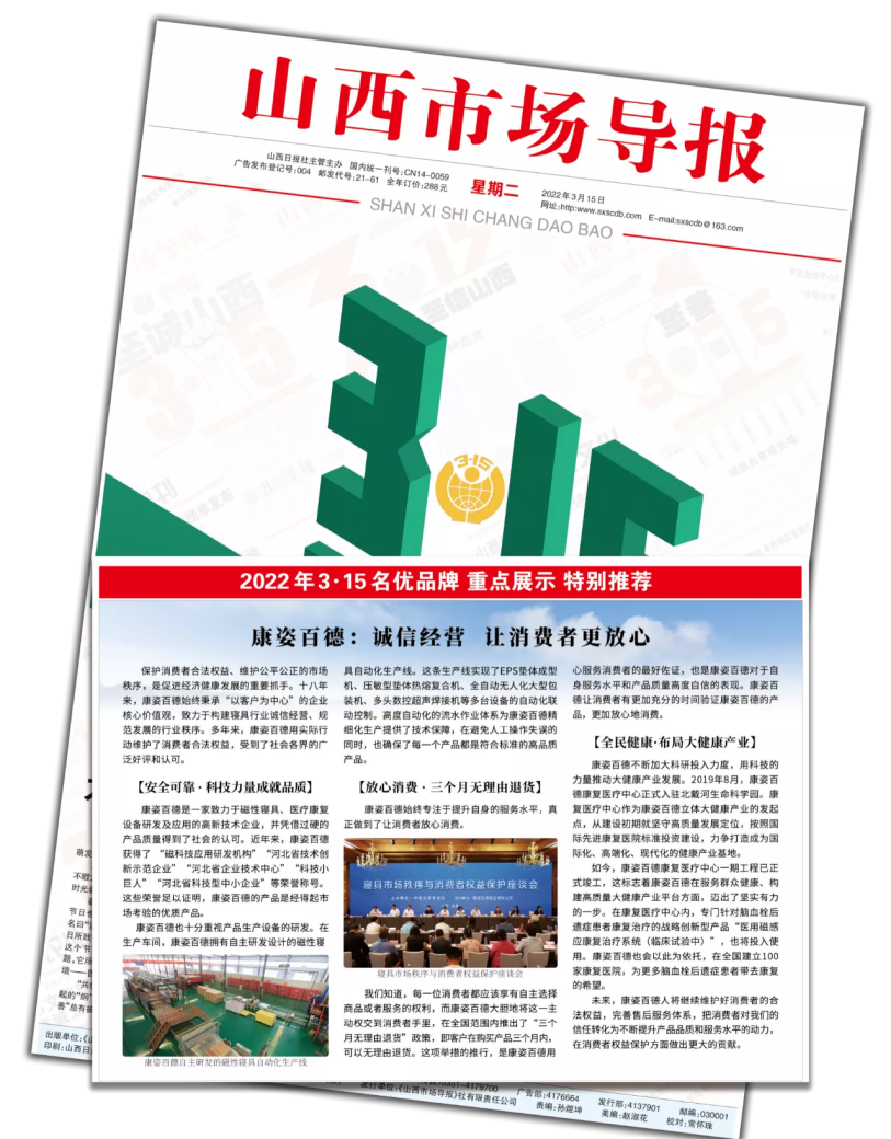 《山西市場(chǎng)導(dǎo)報(bào)》以“康姿百德:誠(chéng)信經(jīng)營(yíng) 讓消費(fèi)者更放心”為主題對(duì)康姿百德的報(bào)道?!渡轿魇袌?chǎng)導(dǎo)報(bào)》是由山西省工商行政管理局主管主辦的機(jī)關(guān)報(bào)。