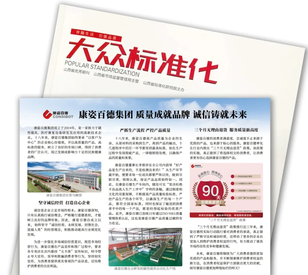 山西市場(chǎng)監(jiān)督管理局唯一發(fā)行的期刊《大眾標(biāo)準(zhǔn)化》雜志,也對(duì)康姿百德進(jìn)行了報(bào)道。