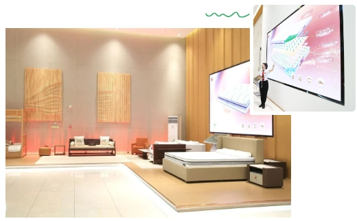 科技展廳安裝了智慧互動屏設(shè)備,上下兩個屏幕聯(lián)動,小屏控制大屏。用手操作觸控一體機,可放大至穿透產(chǎn)品,實現(xiàn)康姿百德床墊的360°模型展示。全新的互動展示效果,讓參觀人員可以更直觀地了解康姿百德床墊的結(jié)構(gòu)。