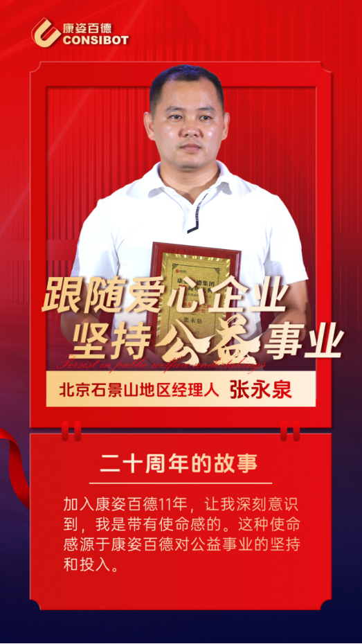 他常說“成功的關(guān)鍵在于不斷沉淀與堅(jiān)持”。自加入康姿百德11年來,他以飽滿的熱情和堅(jiān)韌不拔的毅力,不斷提升服務(wù)質(zhì)量,努力為客戶創(chuàng)造更大的價(jià)值。懷揣著對公益事業(yè)的熱情和無盡的動(dòng)力,堅(jiān)持公益,默默貢獻(xiàn)著自己的力量。他就是康姿百德北京石景山地區(qū)經(jīng)理人張永泉。
