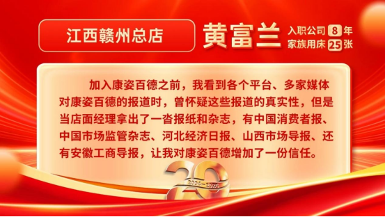 據(jù)黃富蘭回憶,在加入康姿百德時有一個小插曲。“當(dāng)時是想找份工作,正好看到康姿百德門店在招聘店員,走進(jìn)去后店面經(jīng)理正給應(yīng)聘者做企業(yè)介紹,還介紹到了多家媒體對康姿百德進(jìn)行過報道。當(dāng)時我看到各個平臺、多家媒體對康姿百德的報道時,曾懷疑這些報道的真實(shí)性,擔(dān)心是門店作假。店面經(jīng)理看出了我的顧慮,拿出了一沓報紙和雜志,有中國消費(fèi)者報、中國市場監(jiān)管雜志、河北經(jīng)濟(jì)日報、山西市場導(dǎo)報、還有安徽工商導(dǎo)報,讓我對康姿百德增加了一份信任。”