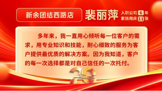 今年是康姿百德集團(tuán)成立20周年。在20年的發(fā)展歷程中,有這樣一群人,他們在市場經(jīng)營管理過程中,深刻貫徹以客戶為中心的理念,始終把優(yōu)質(zhì)的服務(wù)融于門店經(jīng)營的每個環(huán)節(jié),也因此得到了客戶的贊賞和認(rèn)可。他們就是康姿百德專賣店的員工。本期和您分享的是康姿百德江西地區(qū)專賣店員工代表的故事。