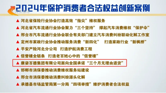 3月15日晚,河北廣播電視臺(tái)聯(lián)合河北省市場(chǎng)監(jiān)督管理局、河北省消費(fèi)者權(quán)益保護(hù)委員會(huì)、全國(guó)16省市電視臺(tái)推出的3·15特別節(jié)目中,河北省消費(fèi)者權(quán)益保護(hù)委員會(huì)秘書(shū)長(zhǎng) 王守用現(xiàn)場(chǎng)宣布了2024年保護(hù)消費(fèi)者合法權(quán)益創(chuàng)新案例??底税俚录瘓F(tuán)有限公司面向全國(guó)承諾“三個(gè)月無(wú)理由退貨”,成功入選。