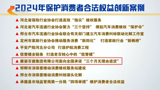 3月15日晚,河北廣播電視臺聯(lián)合河北省市場監(jiān)督管理局、河北省消費(fèi)者權(quán)益保護(hù)委員會、全國16省市電視臺推出的3·15特別節(jié)目中,河北省消費(fèi)者權(quán)益保護(hù)委員會秘書長 王守用現(xiàn)場宣布了2024年保護(hù)消費(fèi)者合法權(quán)益創(chuàng)新案例??底税俚录瘓F(tuán)有限公司面向全國承諾“三個月無理由退貨”,成功入選。