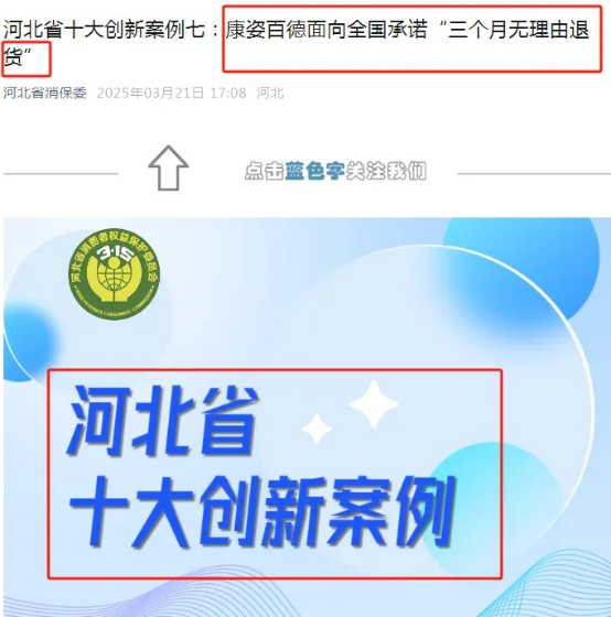 河北省消費(fèi)者權(quán)益保護(hù)委員會還在其官方微信公眾號上,對康姿百德入選“河北省十大創(chuàng)新案例”進(jìn)行了專題推送,將“三個月無理由退貨”作為典范向社會公開推廣。(原文鏈接請點(diǎn)擊:河北省十大創(chuàng)新案例七:康姿百德面向全國承諾“三個月無理由退貨”)