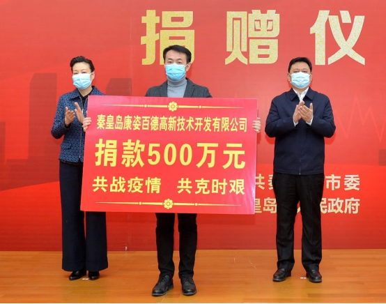 2020年2月1日,康姿百德集團(tuán)參加由秦皇島市市委、市政府舉行的“同舟共濟(jì)共克時(shí)艱堅(jiān)決打贏疫情防控阻擊戰(zhàn)”捐贈(zèng)儀式,向社會(huì)捐贈(zèng)了500萬(wàn)元現(xiàn)金和價(jià)值近100萬(wàn)元的口罩、防護(hù)服等防疫物資。