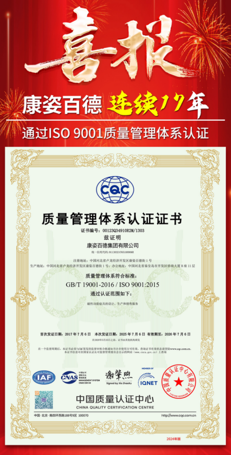 憑借過硬的質(zhì)量管理實(shí)力、完善的質(zhì)量管理體系、高效精細(xì)化的管理模式,康姿百德再次通過了ISO 9001質(zhì)量管理體系認(rèn)證。這也是康姿百德連續(xù)17年通過該質(zhì)量管理體系的認(rèn)證和再認(rèn)證。